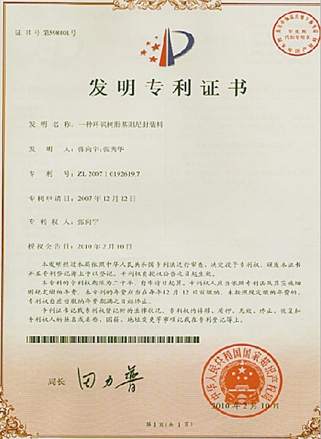 此專利于2007年向國家產(chǎn)權(quán)局提交發(fā)明專利申請(qǐng),經(jīng)過長(zhǎng)達(dá)兩年多的審核 認(rèn)證,于2010年2月通過審核環(huán)氧樹脂基阻尼封裝料專利證書,成功獲得該專利號(hào):ZL2007 1 0192619.7