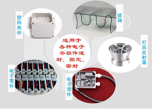 電子、燈具等常用的密封膠一般用來作粘結(jié)、絕緣、耐溫、防潮等用途。廣泛用于電加熱器、電熱管、儀表儀器、分析電極、電熱插頭、電熱器的粘合、密封、絕緣;設(shè)備管理的防腐及表面保護。