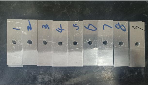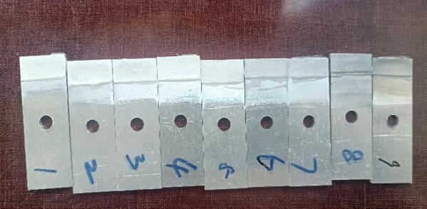 我們選取的砂布目數(shù)為:60、120、180、320、600、800、1200、1500、2000。我們分別按1-9給這個(gè)試片進(jìn)行排序。1代表60目,2代表120目...,我們能從打磨痕跡看出,號(hào)數(shù)越大的,打磨越細(xì)膩,1500和2000目砂紙打磨的硬鋁試片基本能呈現(xiàn)出鏡面光澤。(下面的圖片拍攝可能是反光問題,不能看出差異,實(shí)物實(shí)際是很能看出來(lái)區(qū)別的,不信你試試,哈哈)
