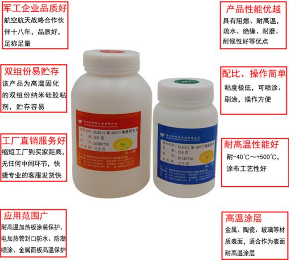 SL8311耐 500℃高溫膠水是一種需要高溫固化的雙組份納米硅膠粘劑,具有阻燃、耐高溫,疏水、絕緣、耐磨、耐候性好等特點,粘度低,可噴涂、刷涂,操作方便。其工作溫度從-40~+500℃,短時可達+600℃。