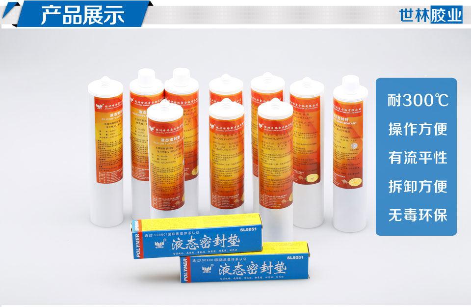 株洲世林膠業(yè)有一款SL5051耐300度液態(tài)密封膠,它是單組份有機硅密封膠,適用于飛機、汽車、摩托車等發(fā)動機、水泵、閥門、齒輪箱、減速箱、真空泵、空壓機等有關(guān)結(jié)合面,密封效果好,,耐水、耐汽油、耐機油、耐老化、具有優(yōu)良的耐介質(zhì)性能,室溫下即可硫化,使用起來非常方便。使用溫度為-60℃~+300℃,短時可達+350℃。目前已大批量的使用在了汽車發(fā)動機制造廠和航空發(fā)動機上。