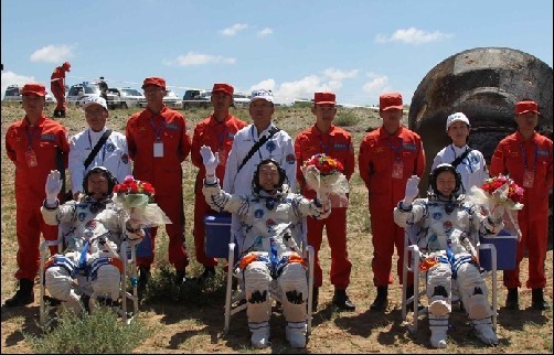 2012年06月29日上午10時,神九載人飛船返回艙在內(nèi)蒙古主著陸場安全著陸,3名航天員身體狀況良好。天宮一號與神舟九號載人交會對接任務(wù)取得圓滿成功。