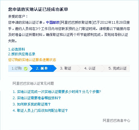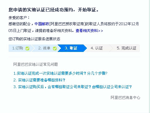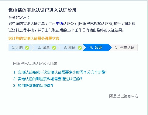 阿里巴巴實(shí)地認(rèn)證服務(wù)分為取證與認(rèn)證兩個(gè)環(huán)節(jié),取證服務(wù)有特定的取證商:中國郵政和中誠信;認(rèn)證服務(wù)有特定的認(rèn)證商:中誠信,杭州中德,北京匯華。如果你那的材料齊全,在上門取證后的16個(gè)工作日內(nèi)會(huì)有認(rèn)證結(jié)果(認(rèn)證成功或認(rèn)證失敗),并且到時(shí)會(huì)有旺旺浮出提醒。