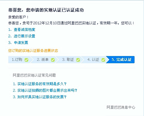世林膠業(yè)在阿里巴巴誠信通會(huì)員歷經(jīng)九年了,謝謝阿里巴巴平臺給世林膠業(yè)的支持.2012年11月底世林膠業(yè)進(jìn)行了實(shí)地認(rèn)證申請,阿里巴巴的認(rèn)證效率非常之高,詳情請看下圖: